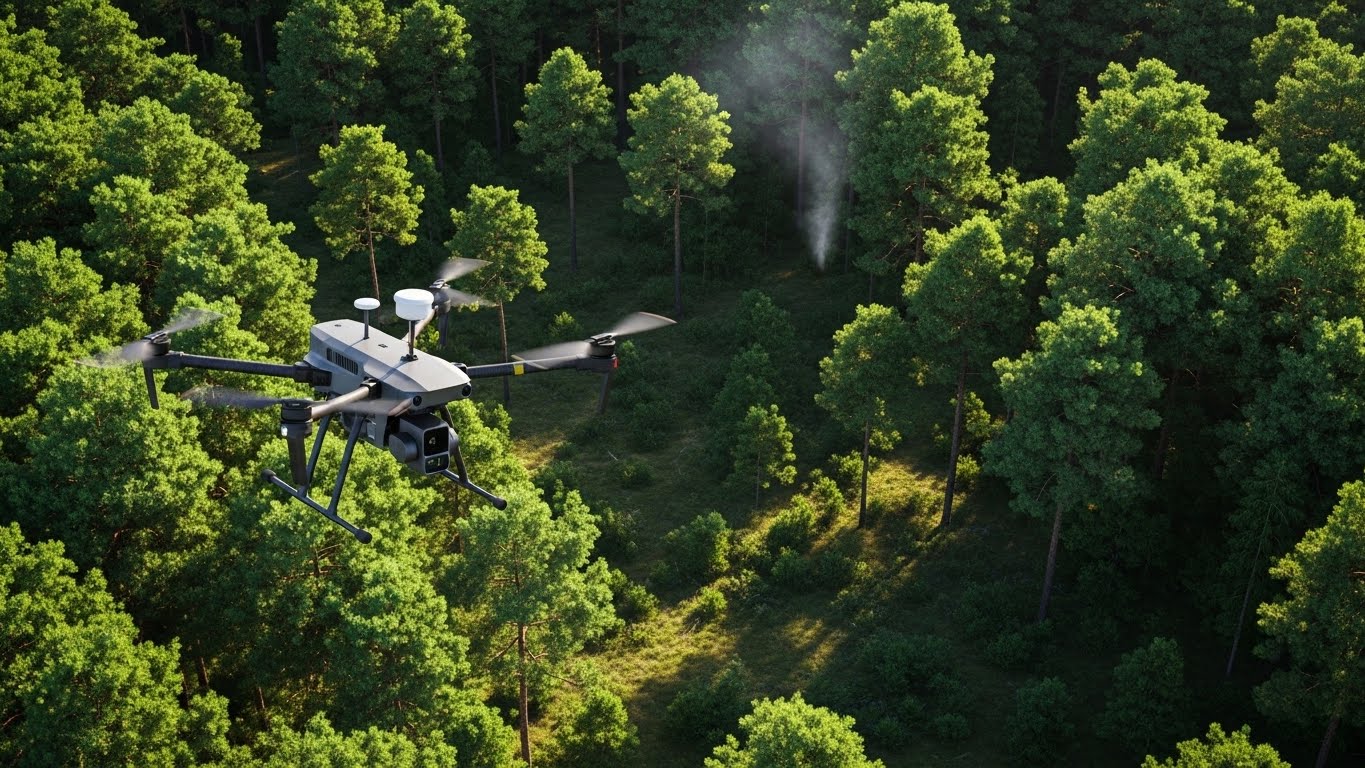 Forested landscapes are transformed into continuously monitored, digitally connected ecosystems through integrated ground sensors and autonomous aerial systems. Under-canopy sensor networks detect early environmental anomalies, while autonomous drones provide rapid verification and precise localization.